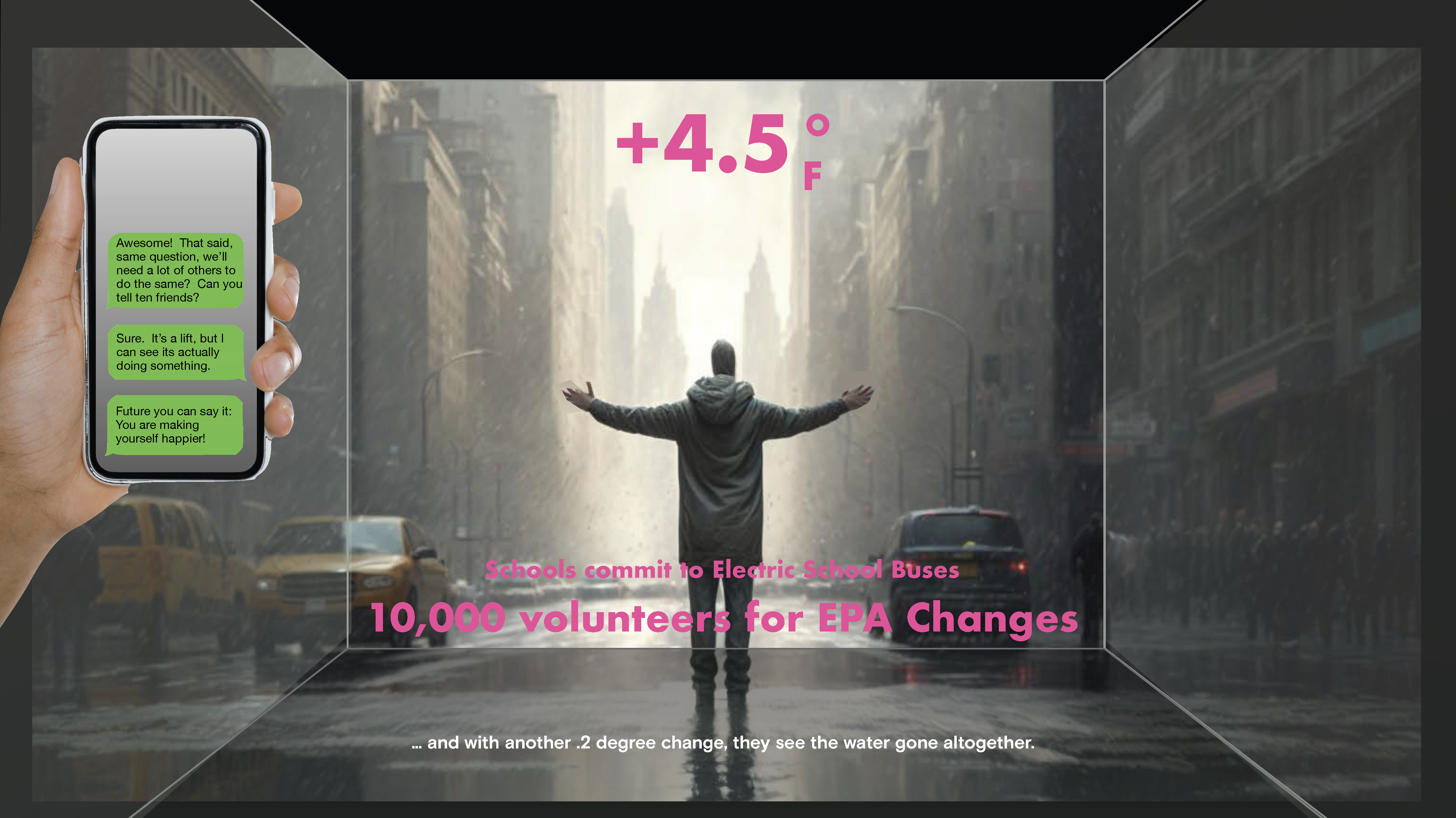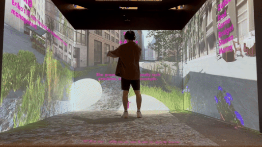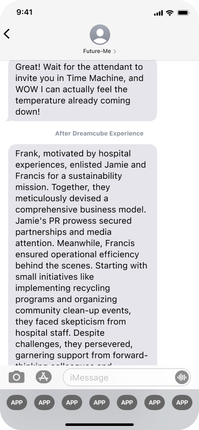 Within the "Time Machine" (a Dreamcube—a room composed of four screens), players converse with a future-me chatbot via text messaging, which will prompt participants to contemplate carbon emissions issues and consider actionable steps they can take in their daily lives, leveraging their current positions and fields of work.